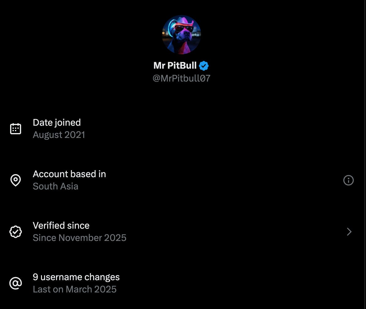 Apart from the connections to the subject of my last post, there are the obvious comparisons to the infamous case of “Inevitable West” (an Indian based in Dubai, also running a Western right-wing grift on X); as well as to the industrial-scale economy of AI slop also run from India, covered in depth at 404 Media. All three use reply spamming to farm followings, along with copypasta. Two are externally monetised with Buy Me a Coffee links, while all three would qualify for ad revenue sharing. All three are “blue-checked”.